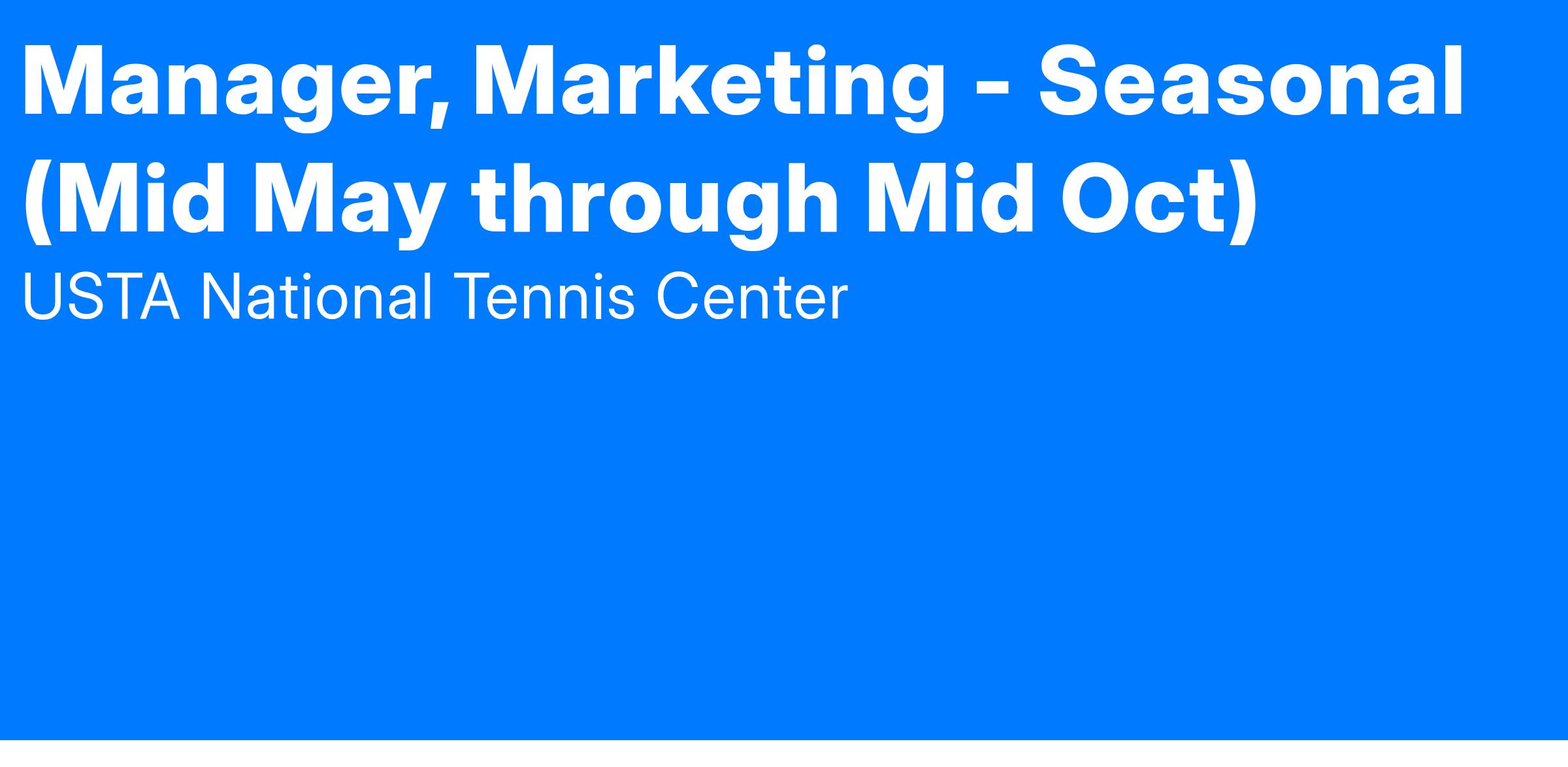 The USTA is seeking a temporary Marketing Manager to support our Facilities & Advocacy Tennis marketing efforts while a Senior Manager is on leave. This position focuses on supporting Tennis Venue Services, schools, sales, and our local marketing partners with strategic marketing guidance, campaign execution, and stakeholder communications.